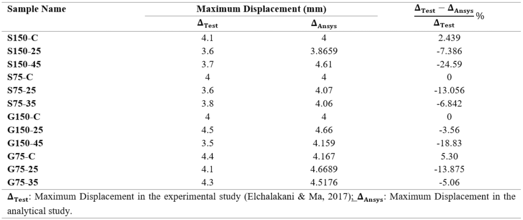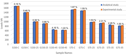 The diagrams demonstrate strong convergence between the analytical and experimental models, with the exception of samples G150-45, S150-45, and S75-35. The irregularity and imbalance present in the experimental laboratory resulted in the slippage of the samples. However, the analytical study remains unaffected by this sliding process. In the analytical study, the load was 4.166% greater than in the experimental study, with a displacement difference of approximately 25%.