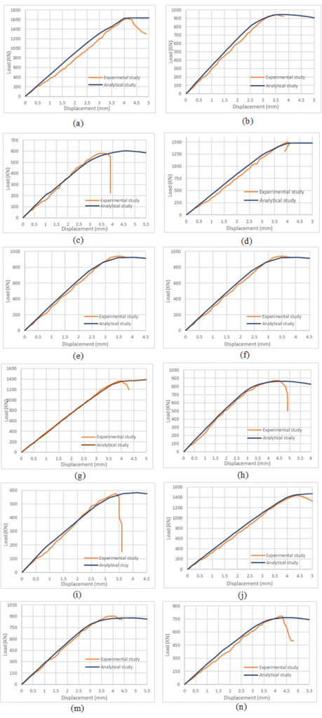 The load-displacement diagrams resulting from the implementation of the proposed model in ANSYS Workbench 2022 R1 were subsequently plotted. As illustrated in Figure 12, there is a substantial convergence with the diagrams presented in the experimental study.