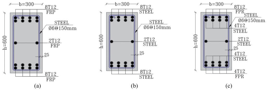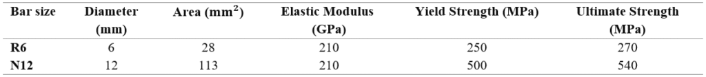 The concrete was designed with a strength of 32 MPa. The three models are indistinguishable in all characteristics. These characteristics include the number and diameter of the bars, modulus of elasticity, and the stress-strain diagram of the concrete, as well as the characteristic strength of the concrete. The distinguishing factor among the three models was the reinforcement material properties of the steel and polymer bars.