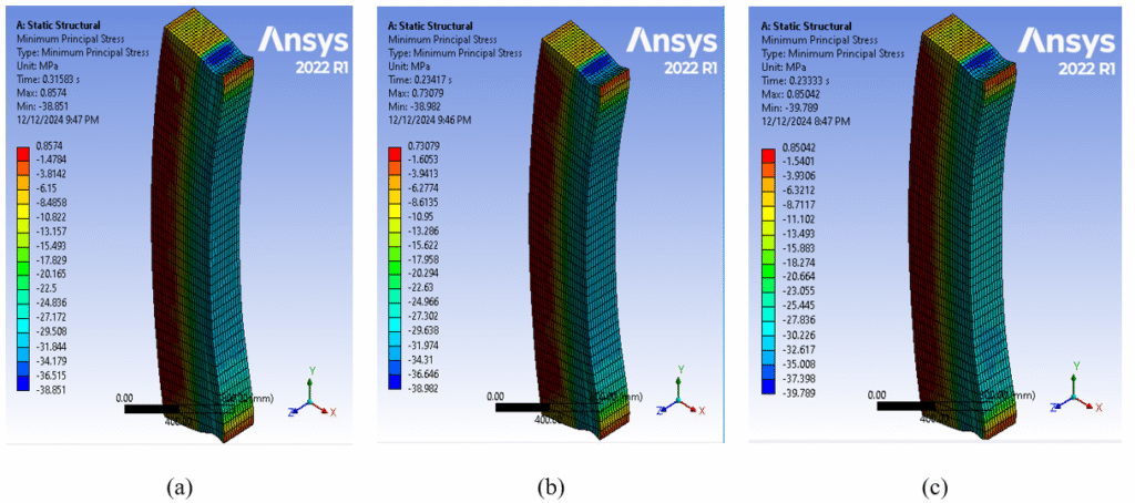 The numerical results are compared with the vertical displacements at the ultimate load for both the analytical study, which utilized ANSYS Workbench 2022 R1, and the experimental study, which was based on sample fracture in the laboratory. These findings are summarized in Table 7. The observed differences between the two studies ranged from 2.439% to 24.59%.