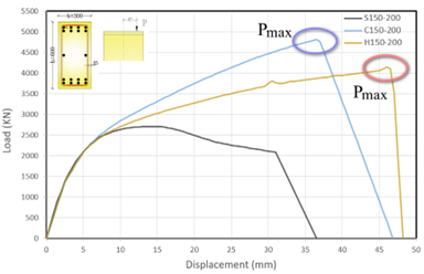 The load-displacement curve for polymer-reinforced specimens exhibited a higher capacity, approximately 8% greater than that of the hybrid-reinforced specimens. The ductility range was found to be extensive but lacked clear definition.
