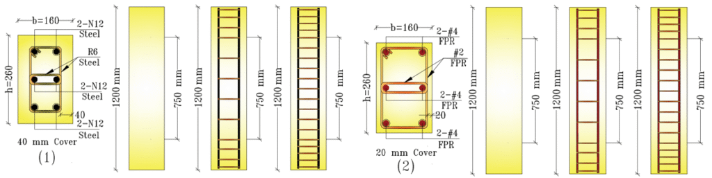 In this experimental program, the steel-reinforced RC columns were detailed with six N12 longitudinal bars and R6 steel stirrups. Four specimens were reinforced at a spacing of 150 mm, and the remaining four were reinforced at a closer spacing of 75 mm. Concurrently, the polymer-reinforced RC columns were constructed using six #4 longitudinal GFRP bars combined with #2 GFRP stirrups, once more with four samples reinforced at 150 mm and four at 75 mm. All specimens were cast using concrete with a maximum aggregate size of 10 mm, as per the specifications outlined in AS 3600. This concrete was designated as Grade 32 MPa. A schematic representation of the steel- and GFRP-reinforced column configurations is provided in Figure 2. The GFRP bars utilized in the study were manufactured in Canada, and the final testing of the V-ROD GFRP reinforcement was carried out by Hadi and Associates, ensuring material compliance and consistency with the experimental requirements (Elchalakani & Ma, 2017).