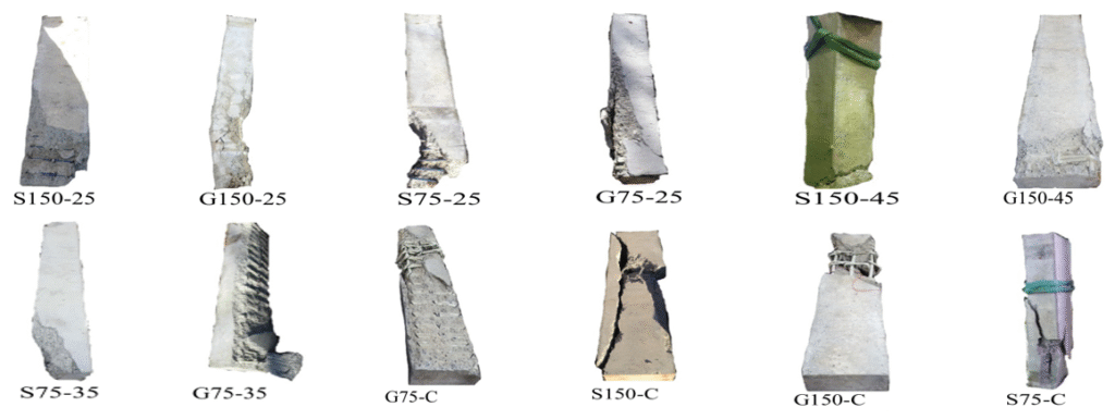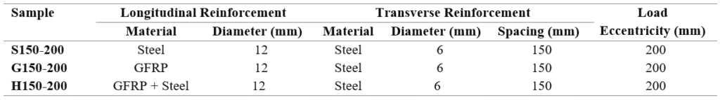 The test area, measuring 750 mm in diameter, is situated at the center of the column. Additional stirrups are positioned above and below the 225 mm test area. The concrete cover for steel-reinforced column samples was placed at a distance of 40 mm from the stirrups, as specified in the Australian Standard. However, the concrete cover was reduced to 20 mm for polymer-reinforced concrete column specimens due to their high corrosion resistance (Elchalakani & Ma, 2017). Tables 1 and 2 show the physical properties of the glass-polymer and steel bars, respectively while Figure 3 shows failure of samples from experimental study. Table 3 shows the mechanical properties of the samples, which involve 12 RC column samples.