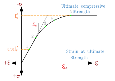 If \( n, f'_c, \) and \( E_c \) are known, the strain at peak stress can be computed from: \[ \varepsilon_0 = \frac{f'_c}{E_c} (\frac{n}{n-1}) \tag{5} \]