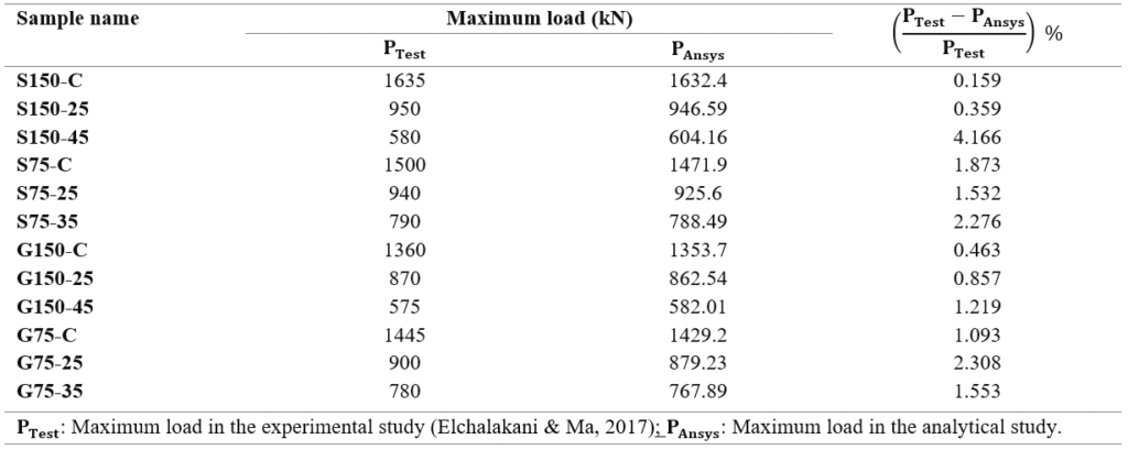 Furthermore, it was observed that the analytical modeling yielded lower values for the ultimate load in comparison to the experimental study.