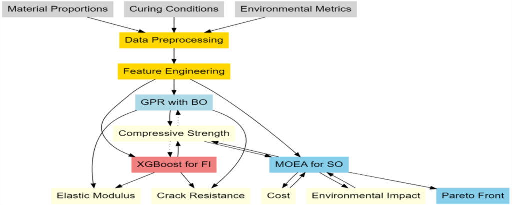 The integration of GPR, Bayesian Optimization, Extreme Gradient Boosting, and MOEAs is a novel method that has the potential to enhance the engineering process by facilitating the practical development of optimized concrete mixtures. Consequently, the GPR-Bayesian Optimization module empowers engineers to predict performance metrics, such as compressive strength and durability, with a high degree of accuracy while efficiently scanning the extensive design space of concrete mixtures. For instance, the incorporation of material and environmental parameters (e.g., limestone powder, carbon nanotube content, and water-cement ratio) into the mixture may enable engineers to make probabilistic predictions of the metrics, thereby diminishing the necessity for exhaustive laboratory testing. The probabilistic framework of GPR provides more than just predicted values; it also provides associated uncertainty, which can aid engineers in determining which mixtures require experimental effort. This, in turn, enables the streamlining of experimental design and the catalysis of directed exploration, allowing for the rapid identification of high-performing mixtures. This approach has been shown to result in significant time and resource savings during the material testing phase, particularly in projects involving rapid design iteration.