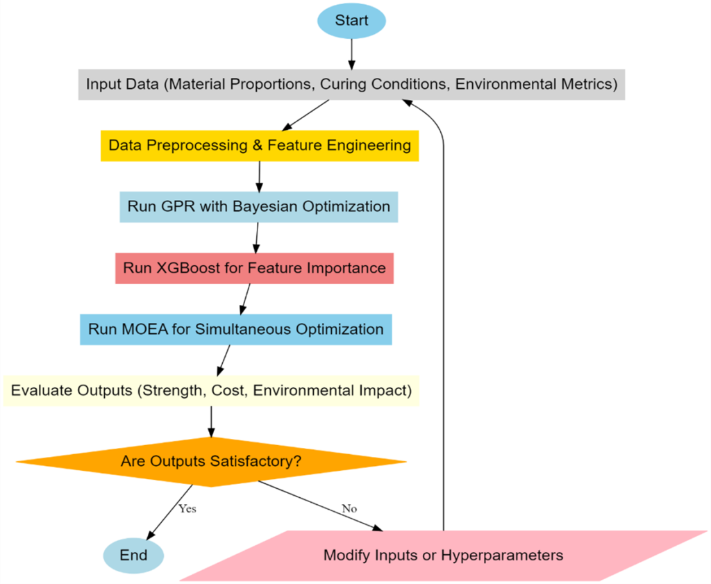 Conventional methods for designing concrete mixtures, which are predicated on empirical relations and trial-and-error experimentation, are often deemed inadequate for the optimization of such complex mixtures (Saxena et al., 2024; Shabanlou et al., 2024; Shiravi & Eftekhar, 2023; Smirnova et al., 2023). The prevailing conventional methodologies employed in this context utilize the single-factor-at-a-time approach, a technique that is both time-consuming and ineffective in identifying the intricate interactions among multiple factors (Syed & Okumus, 2023; Thamboo et al., 2024). In this regard, there is an urgent need for the development and implementation of more sophisticated optimization methodologies. These methodologies must be designed to explore the vast concrete mixture design space in a both efficient and practical manner. This will allow for the identification of optimal compositions and the elucidation of the mechanisms underlying the performance of these materials. Predictive analytics and machine learning have emerged as potent instruments for the optimization of concrete mixtures (Yang et al., 2024; Yankelevsky, 2024). These models are capable of simulating intricate, non-linear relationships between inputs such as mixture proportions and material properties and outputs, including compressive strength and durability metrics. This facilitates the precise and efficient identification of optimal mixtures that are impractical with conventional methods. Among the numerous machine learning techniques, GPR, XGBoost, and MOEAs stand out as particularly promising approaches that have emerged as leading methods for the optimization of concrete mixtures involving the replacement of limestone powder and carbon nanotubes. GPR is a probabilistic modeling technique. In scenarios characterized by data sparsity or elevated costs, this approach is particularly well-suited for applications involving the analysis of concrete mixture properties, where experimental data is limited. In GPR, predictions for performance metrics are derived from an input composition. Additionally, the predictions are accompanied by a measure of uncertainty. The integration of Bayesian optimization with GPR facilitates the efficient sampling of the input space, with the majority of the effort concentrated within regions that are likely to yield substantial performance enhancements. This probabilistic approach is therefore quite useful, especially when dealing with concrete mixture optimization, since mixture composition effects on mechanical properties can be extremely nonlinear and highly complex.