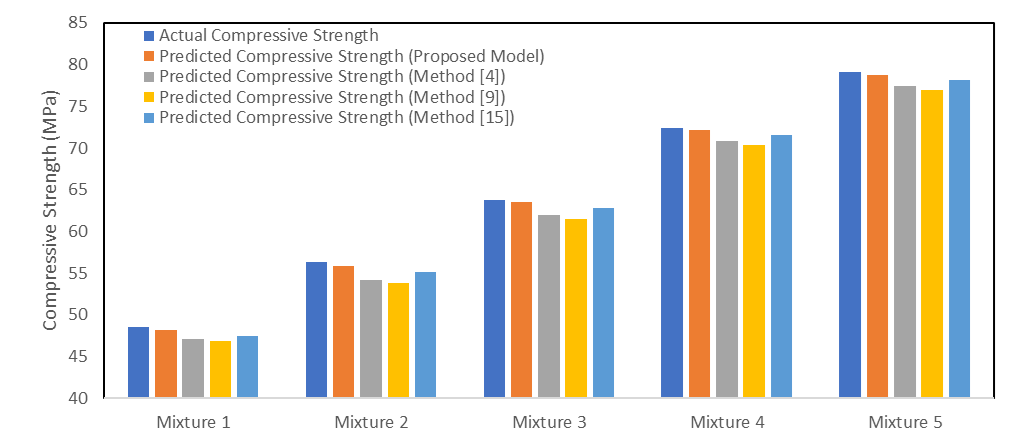As illustrated in Table 2 and Figure 3, the proposed model is compared to real measured and predicted values using Method (DeVine et al., 2025), Method (Kumar & Pratap, 2024), and Method (Nasrin et al., 2024). The comparison is made for the purpose of assessing the accuracy of predicted compressive strength values. The proposed model provides the most accurate predictions of the actual compressive strengths, with a reduced variability in deviations across all mixtures, when compared to other methods. This would suggest that the proposed model exhibits superior capability in capturing the complex relationship between input variables and resulting compressive strength.